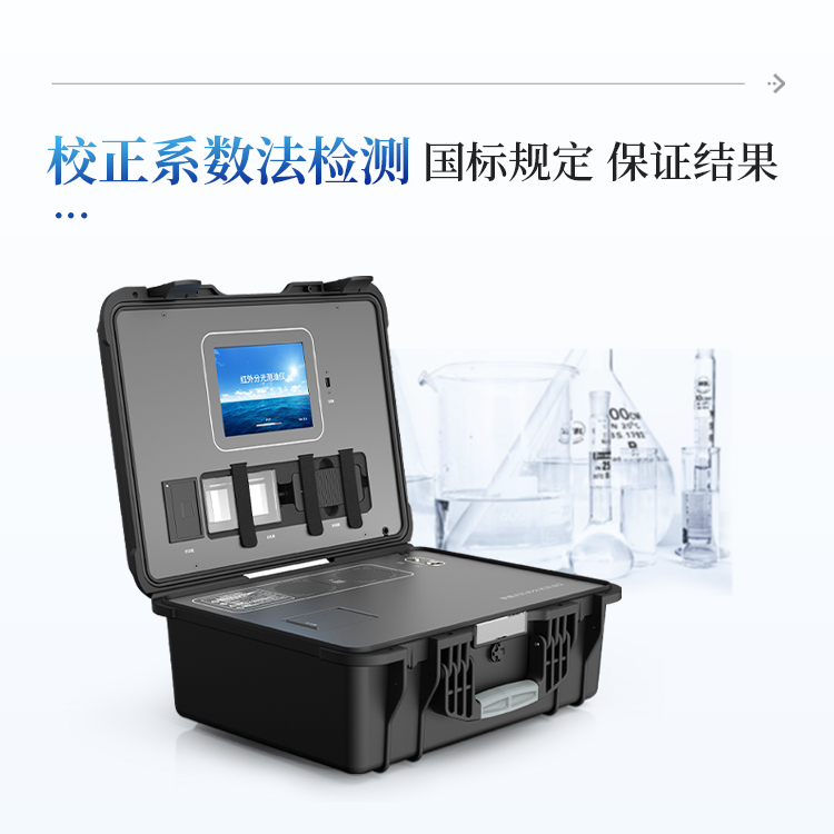 简要描述: 便携式红外测油仪采用了国标规定的校正系数法检测原理,严格按照国标标准公式,使用20mg/L正十六烷,20mg/L异辛烷,100mg/L苯进行校准,最终带入校准公式算出仪器校正系数进行测量样品(也可以使用标准曲线法进行检测);内置无线网络功能,可外接WIFI,实现联网上传功能。